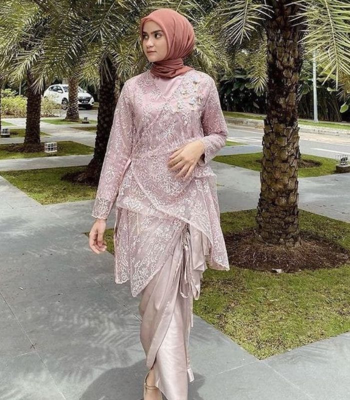 12. Terakhir, pilih kebaya modern dengan model kimono blouse brokat berwarna soft pink seperti ini di kombinasikan dengan rok lilit berbahan satin serta hijab segi empat berwarna choco. Penampilanmu jadi lebih terlihat anggun yang cantik.