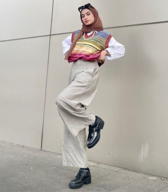1. Pilih knit vest dengan model colorful yang tampak ciamik seperti ini dipadukan dengan kemeja putih dan highwaist loose wide leg pants berwarna beige serta hijab pashmina berwarna coklat. Berikan stand out yang keren pada outfitmu dengan menggunakan sunglasses dan heeled boots.