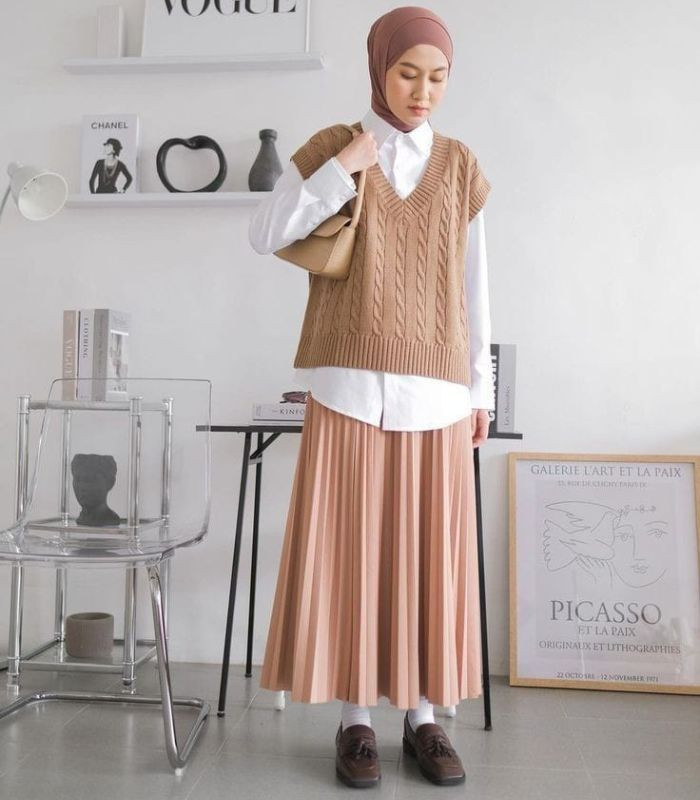 9. Penampilan satu ini memberikan kesan chic dengan warna cerah. Kombinasikan kemeja putih dibalut dengan knit vest berwarna choco serta hijab pashmina dengan warna senada dan tampak cocok dengan rok plisket berwarna latte.