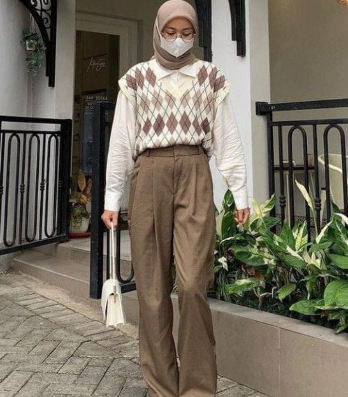 10. Terakhir, gunakan kemeja putih dibalut dengan knit vest bermotif seperti ini dipadukan dengan hijab segi empat serta highwaist loose wide leg pants berwarna khaky yang senada. Tampil feminin look yang kalem.
