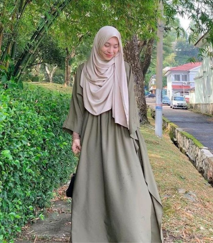 1. Penampilan gaya satu ini terkesan simple namun tetap tampil effortless! Padukan abaya berwarna soft army dengan aksen kerut dibagian pinggang dengan detail selendang di salah satu sisinya dan gunakan hijab pashmina satin berwarna soft beige.