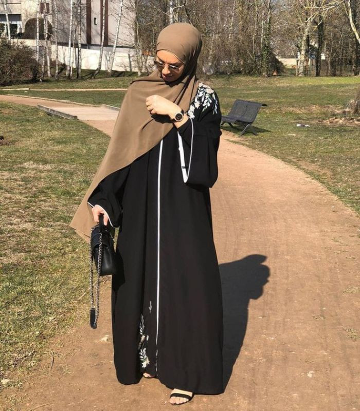 3. Anda juga bisa menggunakan abaya hitam yang modis dengan detail bordir bermotif bunga seperti ini dengan aksen longgar dibagian lengannya Anda bisa siasati dengan menggunakan manset tangan dan pilih hijab pashmina berwarna cappucino. Bikin gayamu jadi lebih tampil chic. Sempurnakan OOTD-mu dengan sunglasses, hand bag dan slip on-sandals.