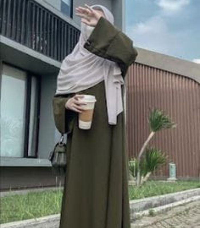 4. Style dengan mengusung perpaduan warna yang terkesan kalem. Gunakan abaya basic berwarna army yang dikombinasikan dengan hijab pashmina berwarna sand beige. Tampil modis yang terkesan simple.