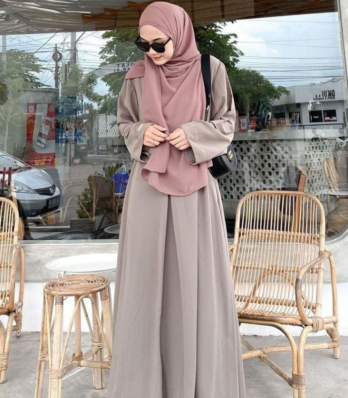 10. Terakhir, mengusung warna soft yang memberikan kesan kalem yang manis. Kombinasikan oversized abaya berwarna brown dengan hijab pashmina berwarna rosy brown yang tampak chic. Berikan stand out pada outfitmu dengan sunglasses, shoulder bag, dan sneakers.