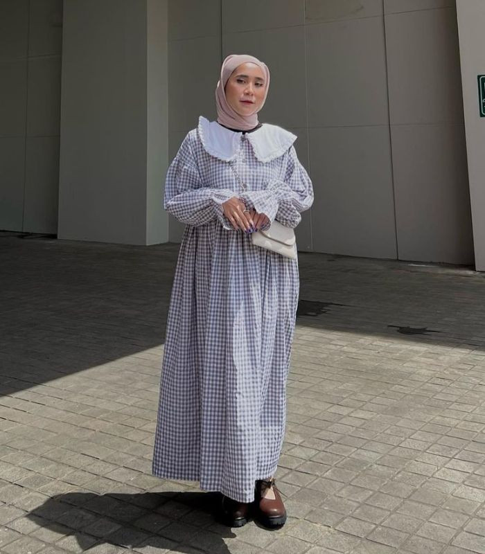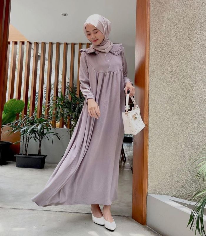 2. Terkesan simple namun terlihat effortless yang memberikan kesan anggun! Kombinasikan long dress dengan aksen wide collar berwarna dusk purple dan pilih hijab pashmina berwarna soft purple seperti ini. Agar outfitmu makin stand out gunakan hand bag dan flat shoes yang senada.