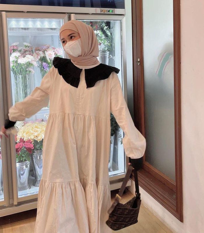 3. Gaya satu ini mengusung tema dengan tampilan monochrome style yang chic! Gunakan white ruffle long dress dengan detail wide collar berwarna hitam padukan dengan hijab pashmina berwarna sand beige.
