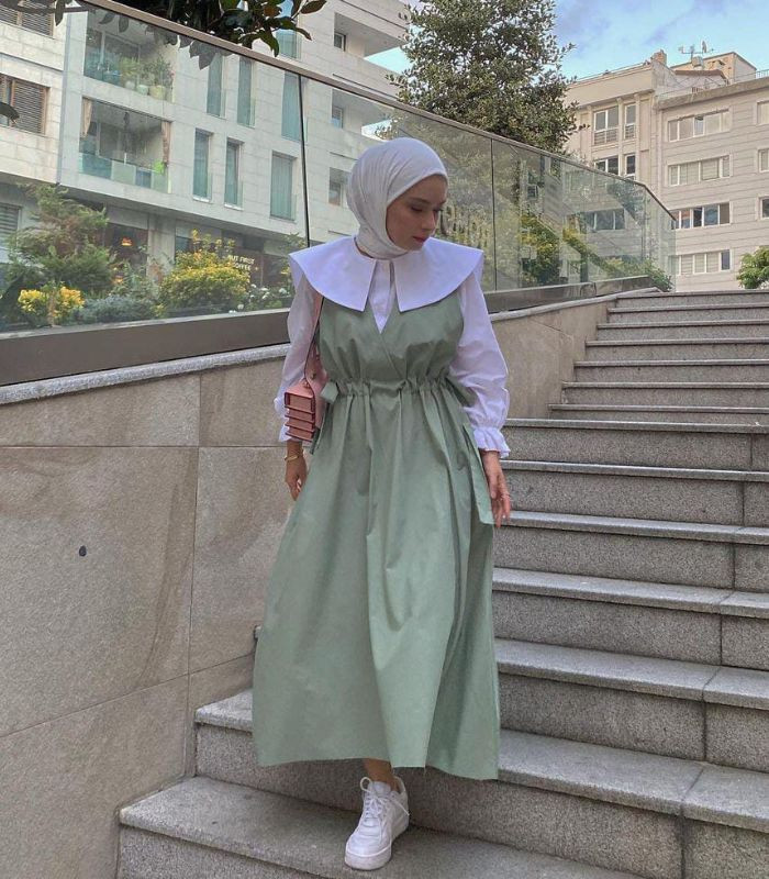 4. Padupadankan kemeja putih dengan detail oversized collar yang dibalut dengan long dress berwarna sage green seperti ini dan gunakan hijab pashmina berwarna putih yang senada dengan sneakers. Tampil fresh look yang terkesan girly banget!