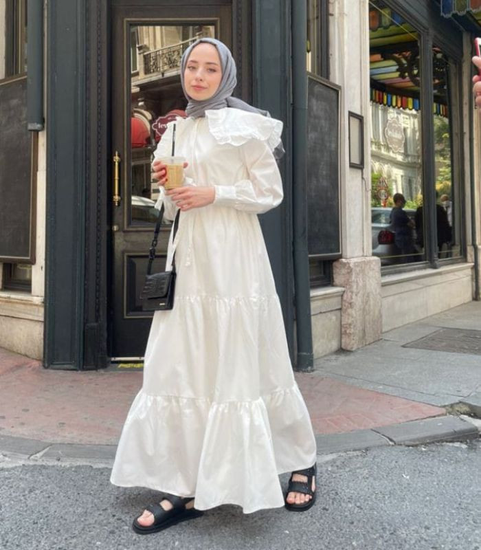 1. Pilih white ruffle maxi dress dengan detail oversized collar menambah penampilan jadi lebih modis padukan dengan hijab pashmina berwarna light grey. Sempurnakan outfitmu dengan sling bag dan slip-on sandals yang senada.