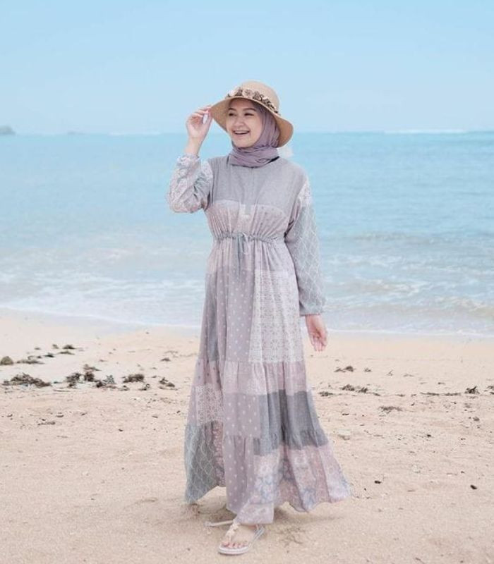 6. Pilih ruffle maxi dress dengan motif abstrak seperti ini dengan warna soft pastel dikombinasikan dengan hijab pashmina berwarna soft purple yang tampak senada. Bikin outfitmu semakin stand out gunakan flopper hat, jadi tampil modis yang kekinian.