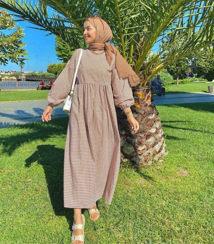 7. Tampil casual Anda bisa menggunakan brown maxi dress dengan aksen kerut dibagian pergelangan tangan dipadukan dengan hijab pashmina berwarna milo. Buat penampilanmu makin all out gunakan shoulder bag dan slip-on sandals yang senada, ya.