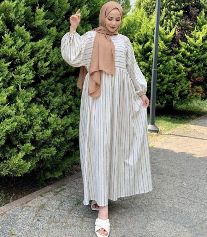 8. Mix and match white oversized striped maxi dress dengan hijab pashmina berwarna brown sugar. Bikin outfit jadi lebih stylish yang memberikan kesan anggun!