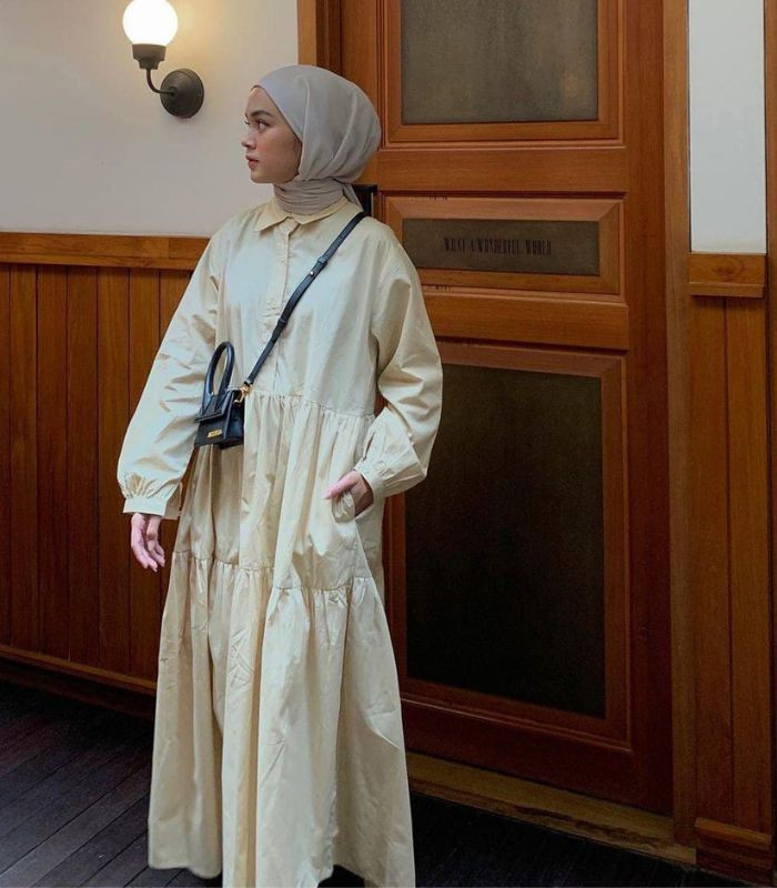 3. Mengusung konsep earth tone dengan warna cerah yang terlihat chic! Gunakan soft yellow ruffle maxi dress dipadukan dengan hijab pashmina berwarna sand beige yang memberikan kesan eye-catchy yang senada.