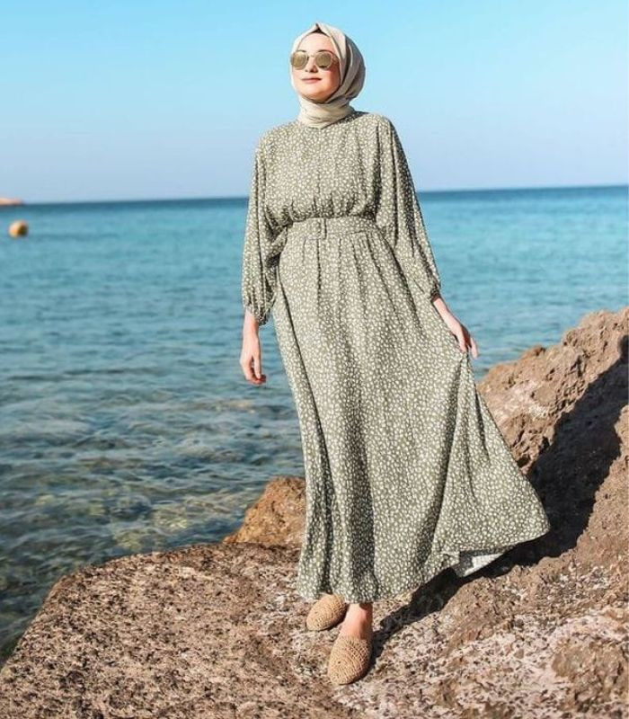 4. Gunakan sage green maxi dress dengan motif polkadot seperti ini dikombinasikan dengan hijab pashmina berwarna soft beige. Tampil simple namun tetap terlihat effortless yang manis!