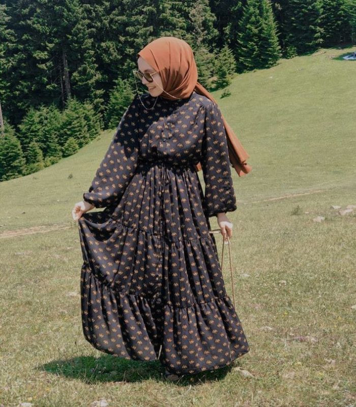 5. Tampil elegan dengan menggunakan black ruffle maxi dress dipadukan dengan hijab pashmina berwarna coklat. Lengkapi outfitmu dengan sunglasses dan shoulder bag.