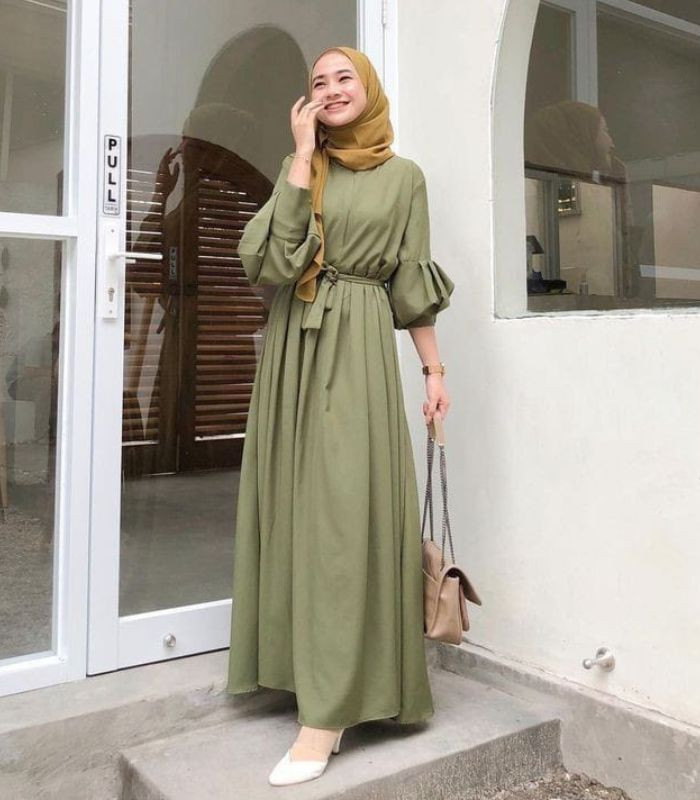 9. Padukan army maxi dress dengan detail tali pinggang yang menambah kesan sebagai pemanis outfitmu, gunakan hijab pashmina berwarna gold. Tampil stylish yang terkesan chic!
