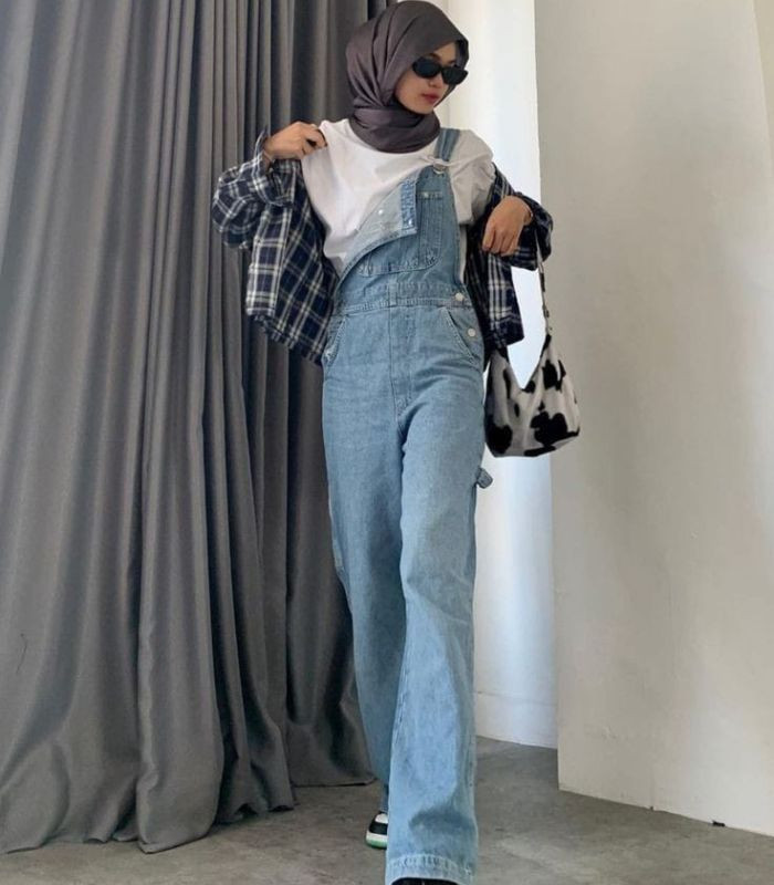 5. Padukan white t-shirt dengan overall highwaist loose jeans dibalut dengan kemeja flannel seperti ini, gunakan hijab pashmina berwarna ash grey. Bikin penampilanmu jadi lebih stylish yang trendy.