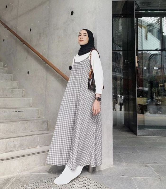 8. Terlihat simple namun tetap tampil effortless yang stylish! Padukan white sweatshirt dibalut dengan overall maxi dress motif kotak-kotak dengan warna light grey serta pilih hijab pashmina berwarna hitam. Lengkapi outfit dengan shoulder bag dan sneakers andalanmu,ya.