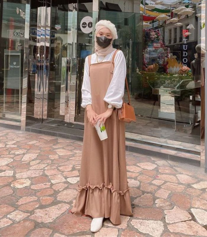 10. Mix and match white blouse dibalut dengan overall dress berwarna milo beraksen ruffle dibagian bawahnya gunakan hijab pashmina berwarna soft beige. Tampil stand out dengan menggunakan baret hat dengan tema light academia yang memberikan kesan softgirl aesthetic.