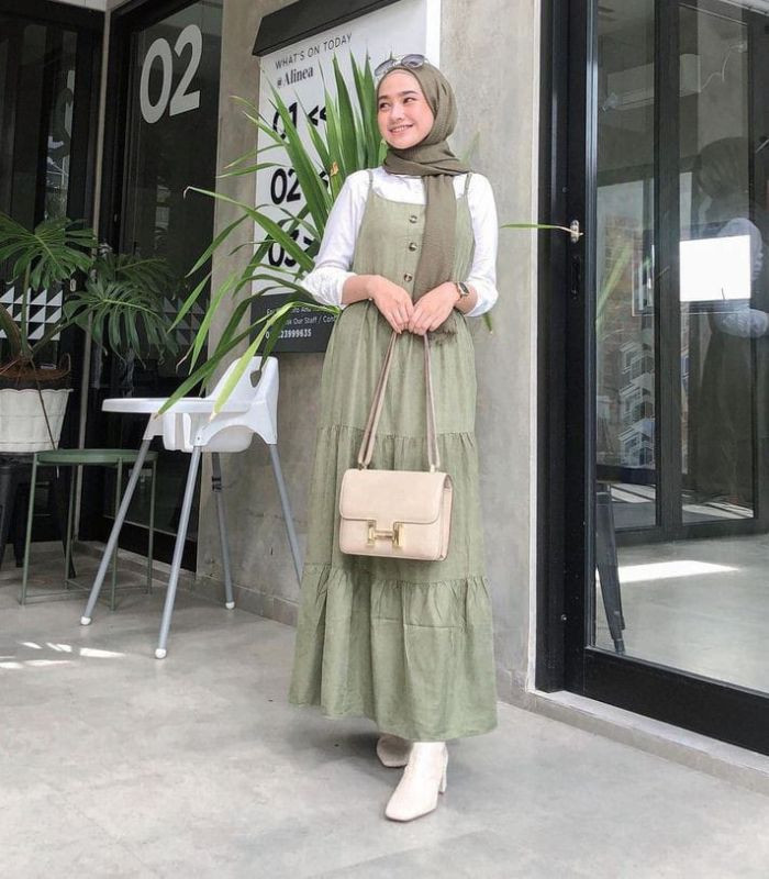 11. Style dengan mengusung tema fresh look yang kalem. Padukan white shirt dibalut dengan overall ruffle dress berwarna sage green serta hijab pashmina berwarna army. Lengkapi outfitmu dengan shoulder bag dan ankle boots.