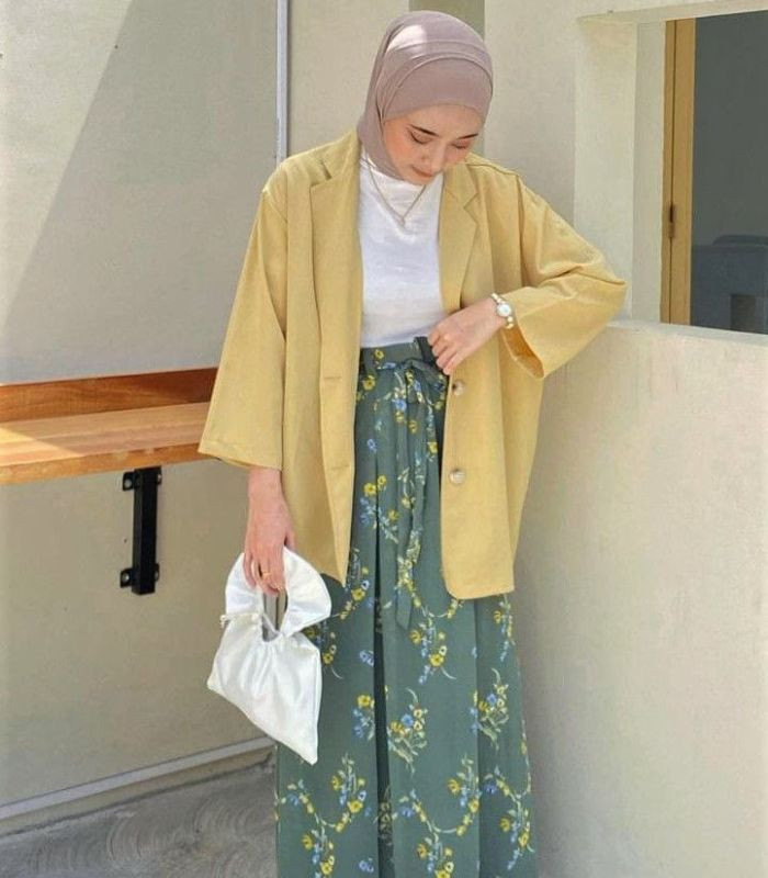 9. Terakhir, dengan mengusung konsep warna colorful cerah yang tampak menarik perhatian. Gunakan white long slevee t-shirt dibalut dengan soft yellow blazer linen dipadukan dengan celana kulot berwarna mint green dengan detail motif seperti ini serta hijab pashmina berwarna latte.