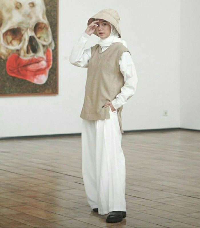 10. Terakhir, mix and match kemeja putih yang senada dengan hijab pashmina serta celana kulot dibalut dengan vest knit berwarna soft beige yang senada dengan bucket hat. Tampil casual namun tetap terlihat stylish yang trendy.