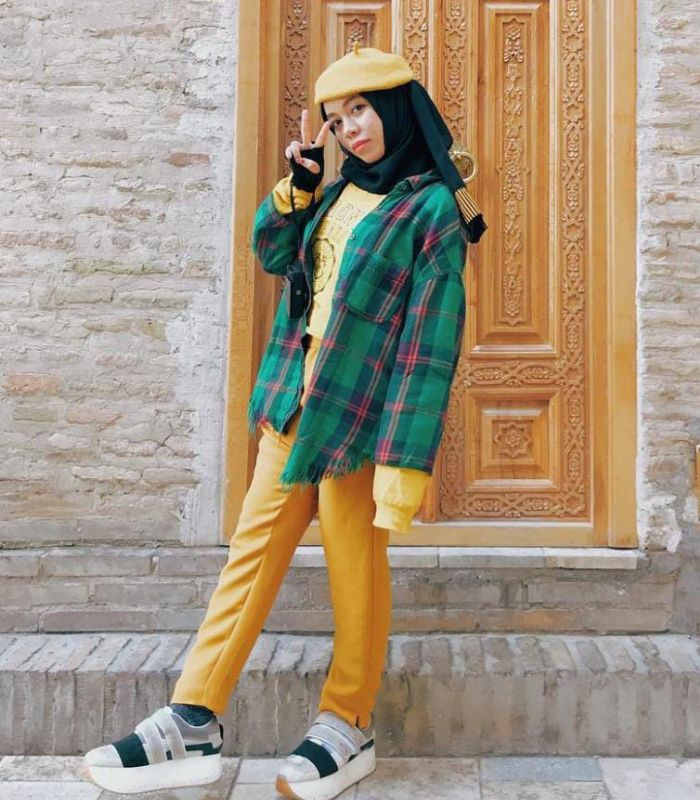 4. Mengusung konsep earth tone yang tampil colorful yang stylish. Kombinasikan soft yellow sweatshirt dibalut dengan kemeja flannel motif kotak-kotak berwarna bottle green dipadukan dengan hijab pashmina hitam serta slim fit pants berwarna kuning yang senada dengan baret hat yang memberikan tampilan jadi lebih all out.