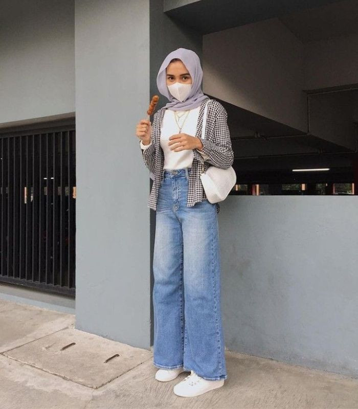 12. Terakhir, gunakan manset berwarna putih dibalut dengan kemeja motif kotak-kotak dipadukan dengan hijab pashmina berwarna light grey serta high waist wide leg jeans. Lengkapi outfit dengan shoulder bag dan sneakers yang senada. Tampil modis yang trendy.