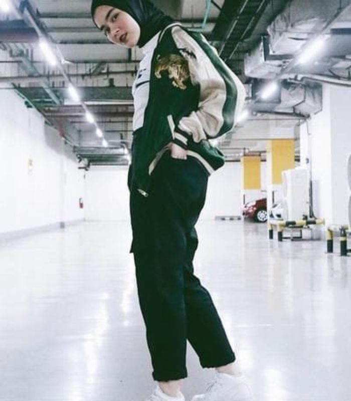 2. Penampilan satu ini memberikan kesan stylish yang kekinian! Gunakan white long sleeve t-shirt dibalut dengan bomber jacket dan cargo pants serta gunakan hijab pashmina berwarna hitam.