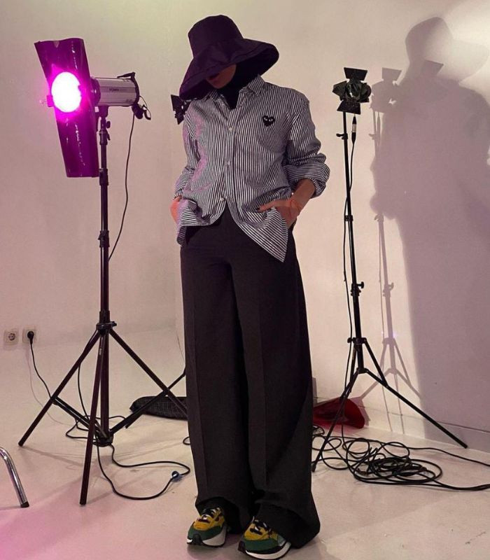 4. Mengusung konsep bernuansa warna gelap yang preppy chic! Padukan striped shirt dengan hijab pashmina serta high waist wide leg pants dengan warna hitam yang senada. Agar penampilanmu tampil stand out gunakan floppy hat dan sneakers andalanmu.