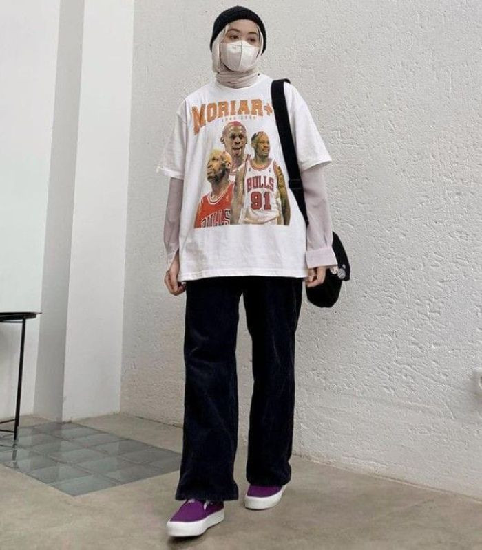 1. Gaya pertama diawali dengan kemeja sand beige dibalut dengan white t-shirt bergambar seperti ini dipadukan dengan hijab pashmina berwarna sand beige dan high waist wide leg pants berwarna hitam yang senada dengan beanie hat dan sling bag. Tampil simple namun tetap terlihat effortless!