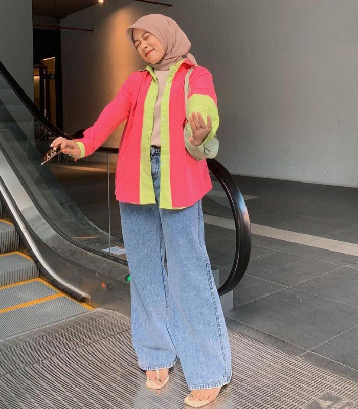 6. Gunakan kemeja dengan model double perpaduan warna neon dan pink yang menutupi dusty pink t-shirt dipadukan dengan hijab segi empat berwarna soft choco serta high waist wide leg jeans. Tampil cantik yang memberikan kesan modis yang kekinian.