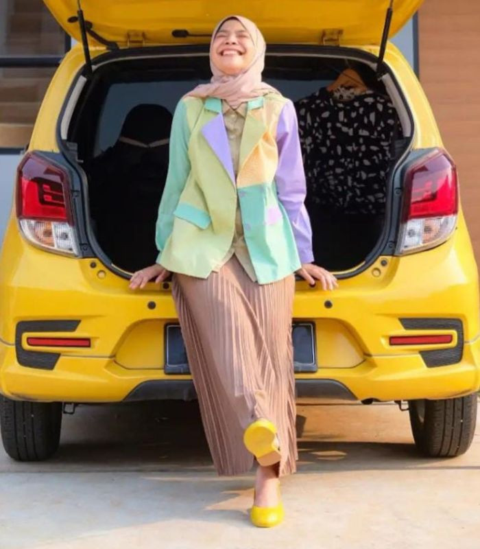 7. Padu padankan kemeja sage green dibalut dengan sweet suit model seperti ini serta gunakan hijab pashmina berwarna soft pink dan rok plisket berwarna milo. Penampilanmu jadi lebih maksimal yang terkesan cantik.