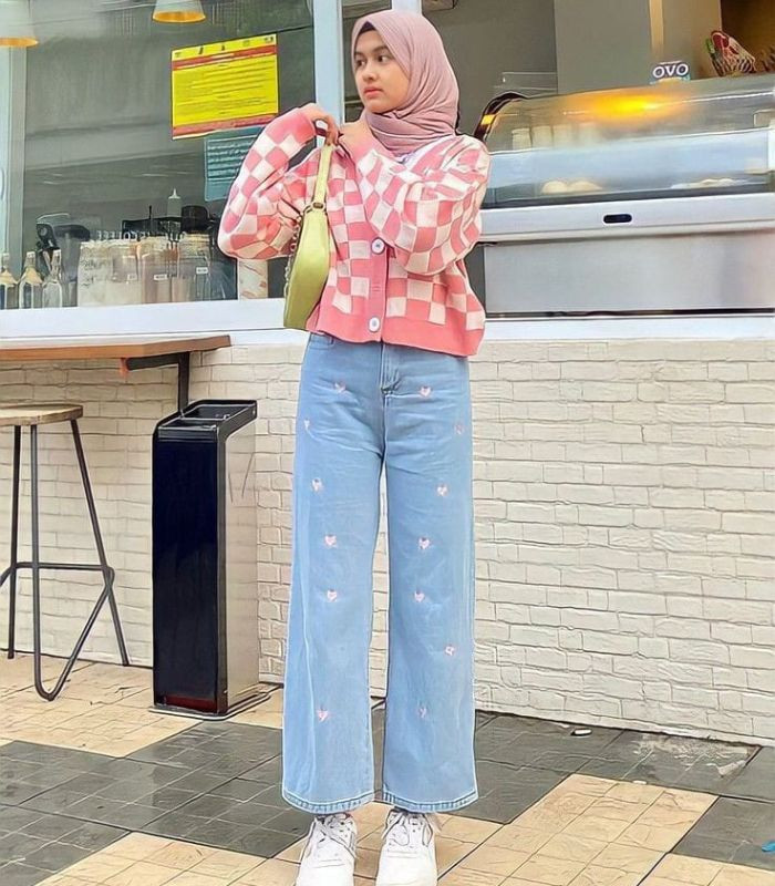8. Gunakan soft pink crop top cardigan motif kotak-kotak di kombinasikan hijab pashmina berwarna dusty pink serta high waist loose pants. Lengkapi outfit-mu dengan shoulder bag dan sneakers favoritmu.