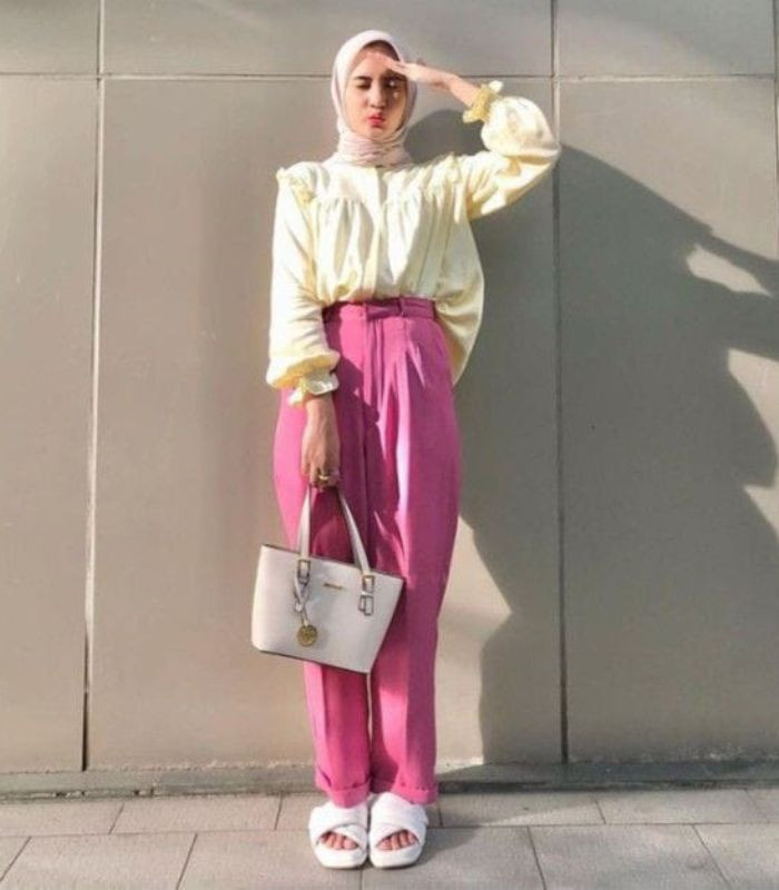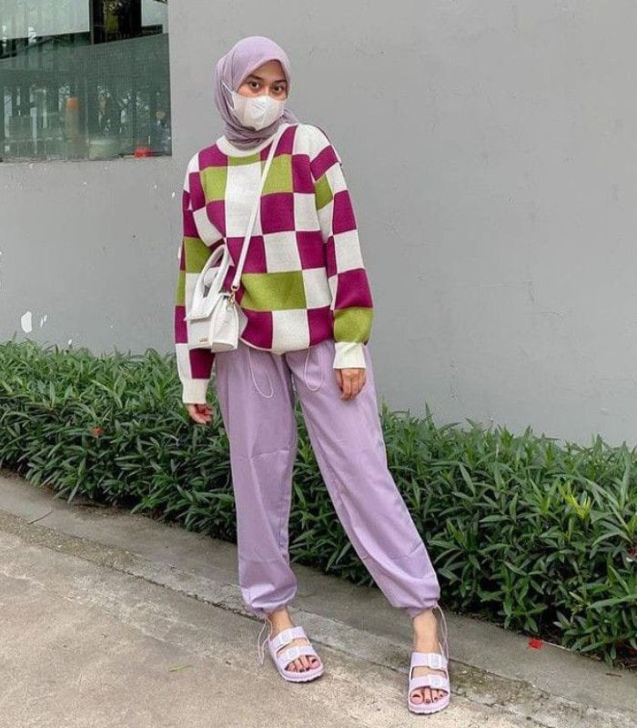 10. Terakhir, terlihat colorful yang tampak chic gunakan oversized sweater dengan motif kotak-kotak seperti ini di kombinasikan dengan hijab segi empat dan jogger pants berwarna lilac yang senada. Lengkapi outfit dengan sling bag dan slip on-sandals favoritmu.