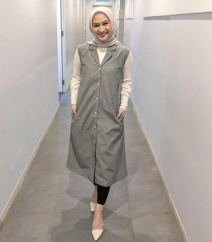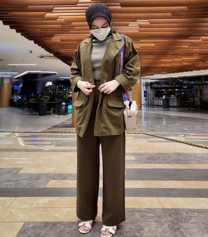 8. Mix and match knit turtleneck berwarna abu-abu dibalut dengan oversized blazer berwarna army dan hijab segi empat hitam bermotif serta high waist loose pants berwarna coklat. Tampil colorful namun tetap terlihat stylish, agar tampilanmu tidak monoton kenakan sling bag dan flat sandals berwarna putih senada.