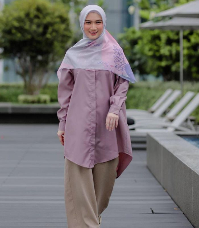 6. Gunakan tunik dusty purple dipadukan dengan maxi skirt berwarna khaky, agar tampilanmu tidak terlihat monoton gunakan hijab segi empat bermotif dengan perpaduan warna soft blue dan soft pink seperti ini. Tampil simple namun tetap terlihat manis, ya.