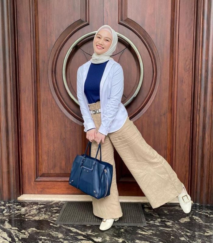 7. Terkesan simple namun tetap terlihat effortless, gunakan manset navy dibalut dengan cardigan berwarna putih dipadukan dengan hijab pashmina berwarna broken white serta high waist wide leg pants berwarna cream lengkap dengan belt. Lengkapi outfit-mu dengan hand bag dan mules heels.