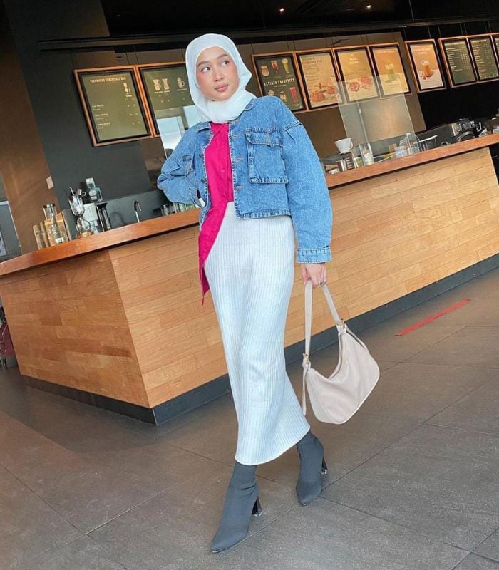 1. Padu padankan kemeja berwarna fuchsia dibalut dengan crop jacket berbahan jeans, serta hijab pashmina dan long pleated skirt berwarna putih yang senada. Agar penampilanmu makin stand out gunakan hand bag dan ankle boots biar makin kekinian.