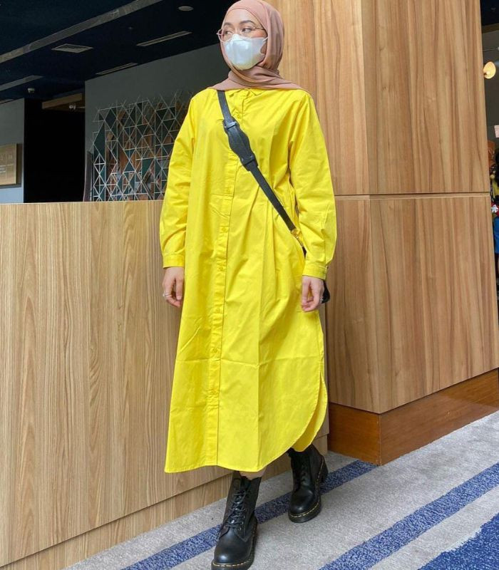 2. Kombinasikan long dress shirt berwarna kuning dengan hijab pashmina berwarna nude, lengkapi outfit-mu dengan sling bag dan combat boots serba hitam. Bikin penampilan-mu terlihat fresh yang cheerful.