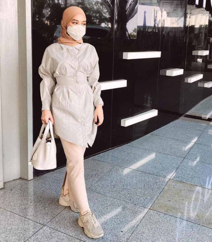3. Terkesan simple namun tetap terlihat modis! Gunakan light grey shirt dengan model kerut dibagian perut seperti ini padu padankan dengan hijab pashmina berwarna caramel serta basic pants berwarna cream. Lengkapi outfit-mu dengan hand bag dan sneakers andalanmu, ya.