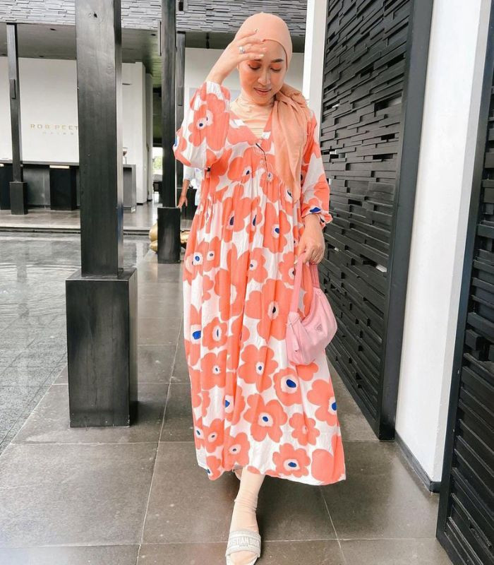 4. Cocok buat Anda yang anti ribet saat pergi hangout! Pakai puff sleeve long dress berwarna soft oranye motif floral, inner, hijab pashmina berwarna salem yang senada tak lupa lengkapi outfit-mu dengan hand bag serta slip on sandals. Tampil stylish yang memberikan kesan cerah!