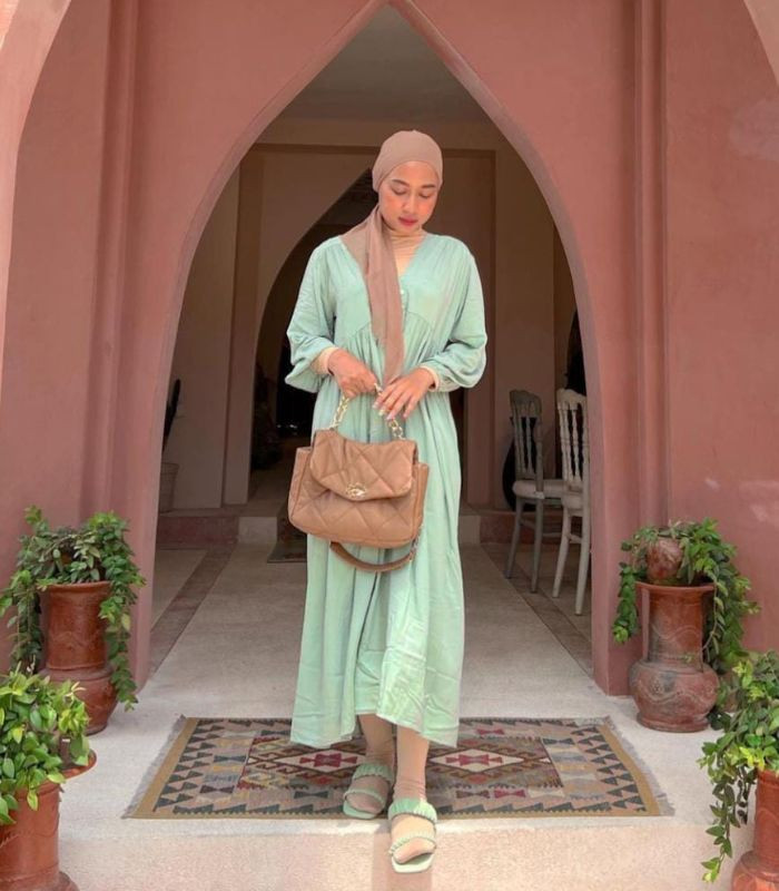 5. Gunakan inner dibalut dengan v-neck midi dress berwarna mint dipadukan dengan hijab pashmina berwarna latte yang senada dengan hand bag serta strap sandals berwarna senada dengan busana. Tampil dengan hijab minimalis yang modis.