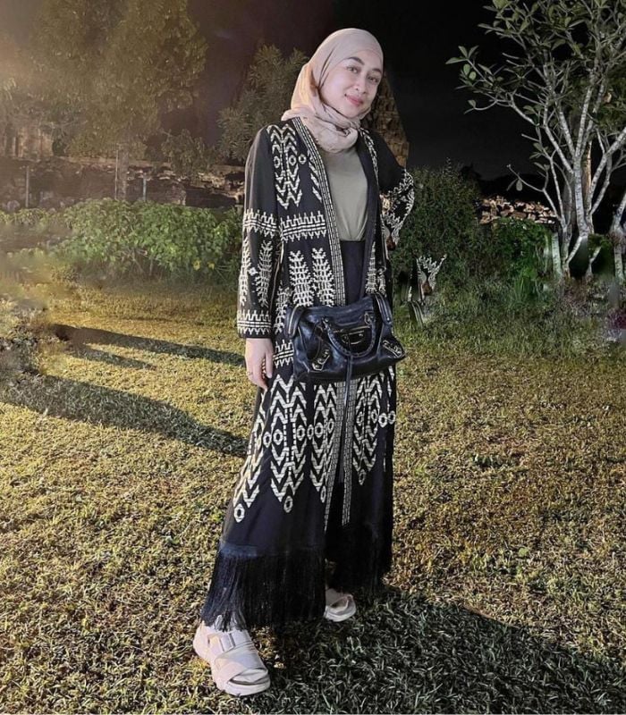 6. Padu padankan inner berwarna khaky dibalut abaya model etnik seperti ini dengan celana kulot hitam serta hijab pashmina berwarna nude. Lengkapi outfit dengan sling bag dan sepatu sandal favoritmu.