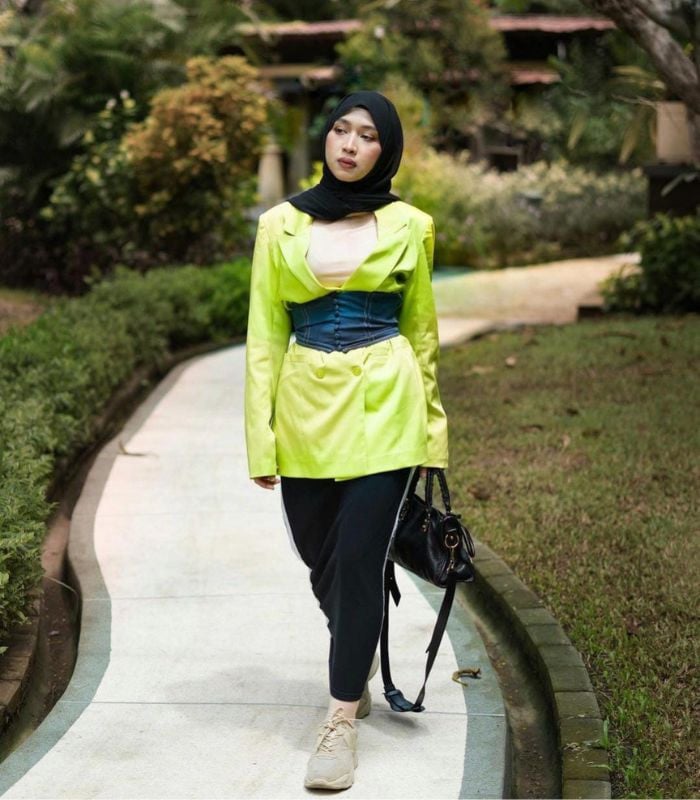 7. Kombinasikan cream inner dibalut dengan blazer berwarna hijau neon berikan aksen unik dengan obi belt model korset serta hijab pashmina dan long pants berwarna hitam senada. Sempurnakan outfit-mu dengan sling bag dan sneakers shoes, bisa jadi inspirasi outfit office look yang kekinian!