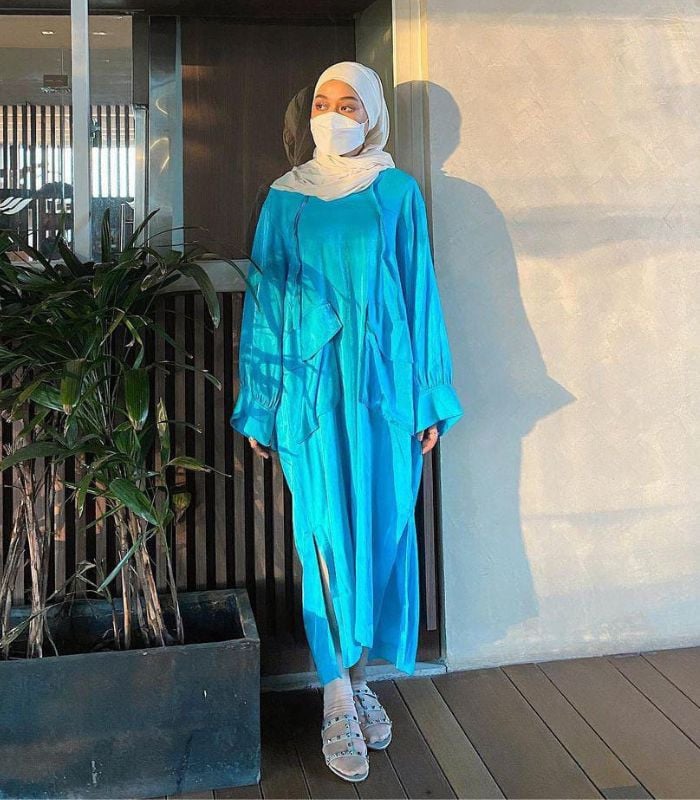 8. Tampil fresh look yang terkesan simple. Gunakan sleeve long dress berwarna biru muda polos dikombinasikan dengan hijab pashmina dan flat sandals dengan warna yang senada.