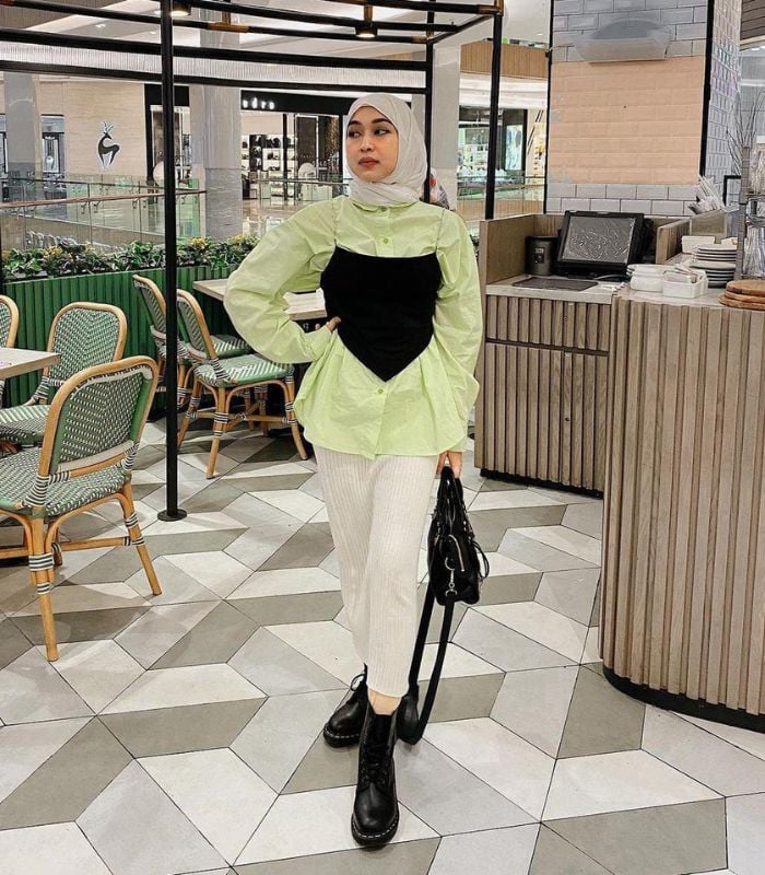 10. Padukan long sleeve shirt berwarna sage green dibalut crop top seperti ini, padankan dengan skirt polos berwarna putih yang senada dengan hijab pashmina. Serta combat boots dan sling bag dengan warna hitam yang senada bikin tampilanmu jadi makin on point.