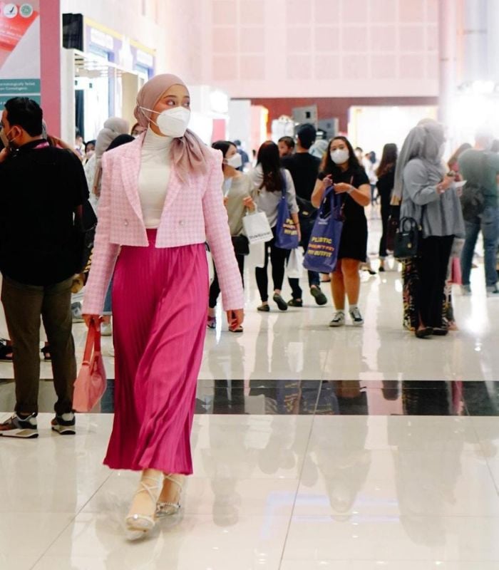 11. Penampilan yang bikin mencuri atensi dengan menggunakan white turtleneck top, dibalut blazer crop kotak-kotak berwarna soft pink. Dipadukan dengan pleated skirt berwarna fuchsia yang mencolok serta lengkapi outfit dengan hand bag dan high heels favoritmu.