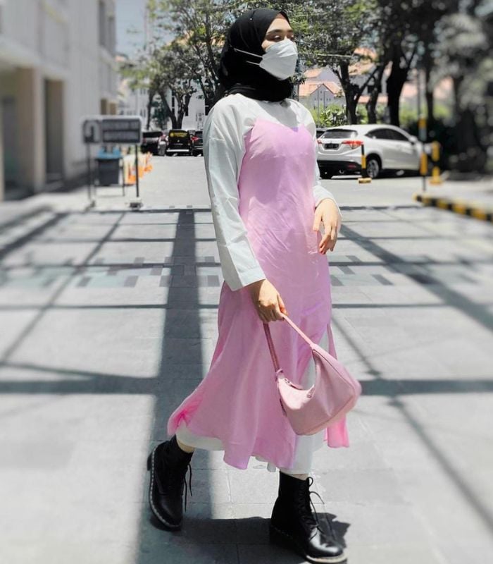 12. Padukan long sleeves top yang dibalut spaghetti strap dress berwarna soft pink padankan dengan hijab pashmina, combat boots dengan warna hitam senada serta hand bag berwarna merah muda. Bikin penampilanmu jadi lebih tampil girly yang trendy.