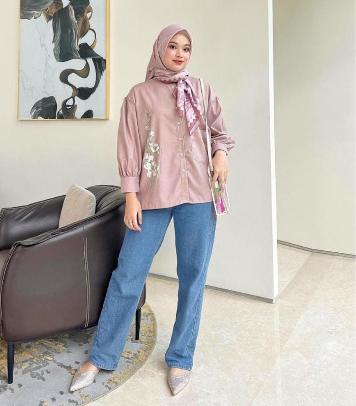 1. Padu padankan kemeja motif floral berwarna dusk purple yang senada dengan hijab segi empat serta gunakan straight jeans. Lengkapi outfit-mu dengan sling bag dan flatshoes. Terkesan simple namun tetap terlihat effortless!