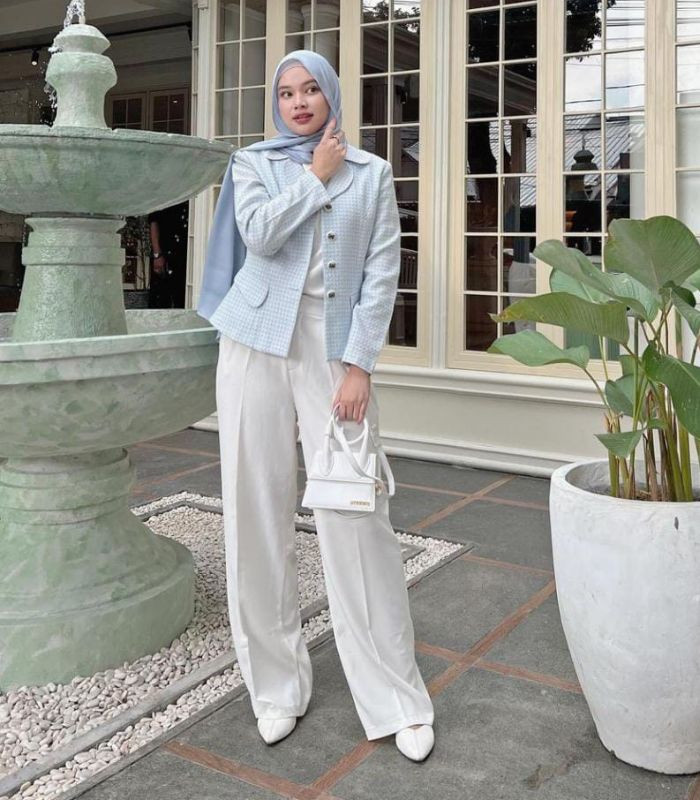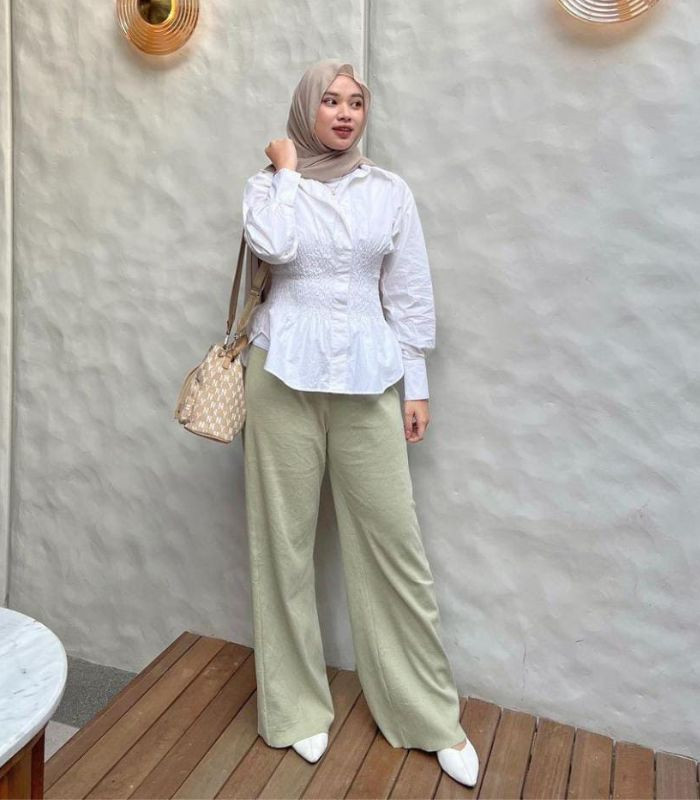 11. Terakhir, pilih white long sleeve shirt dengan aksen kerut di bagian perut di kombinasikan dengan hijab pashmina dan high waist loose wide leg pants berwarna sage green yang senada. Bikin penampilan kamu jadi lebih fresh look. Lengkapi outfit dengan sling bag dan flat shoes.